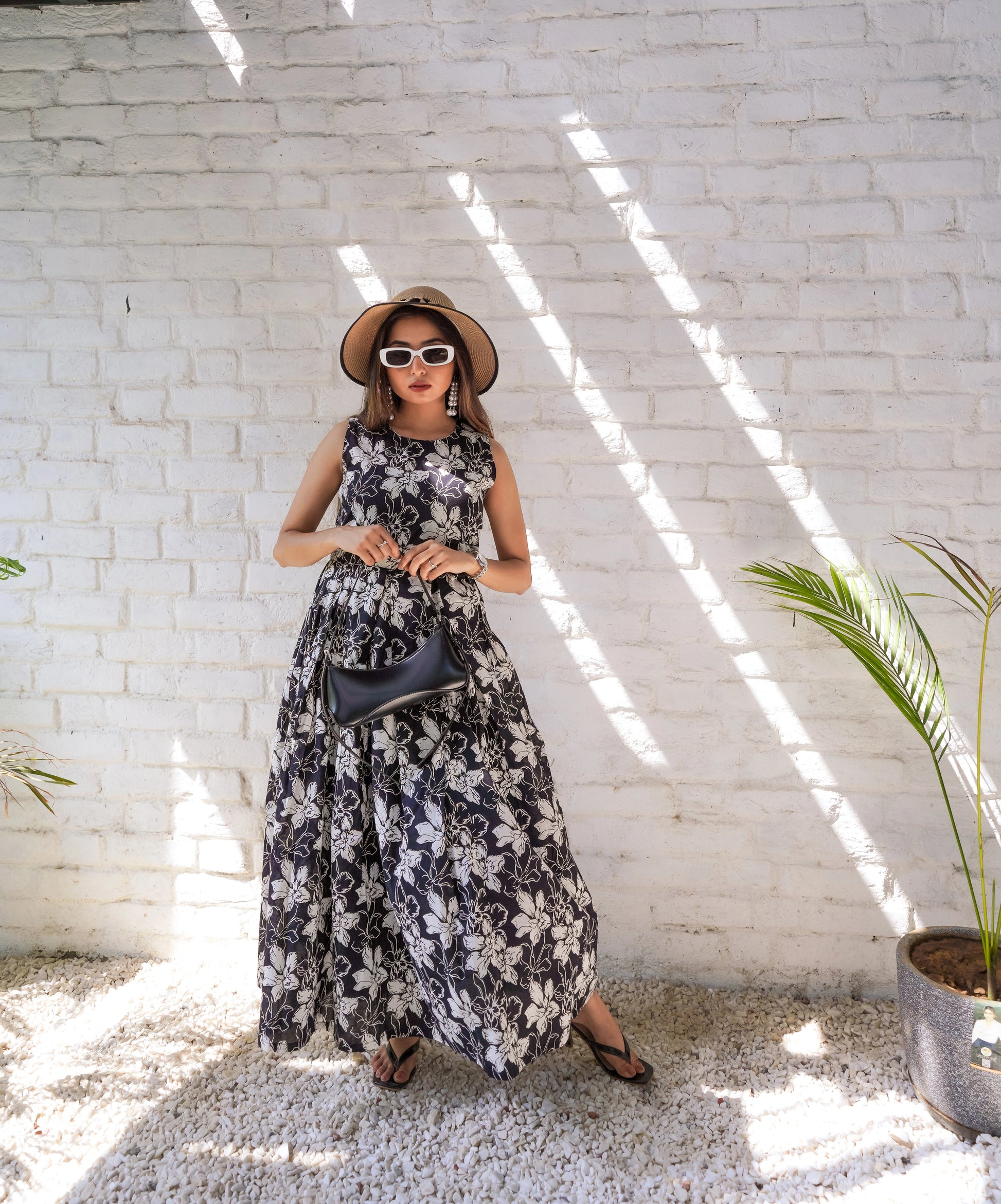 Step into timeless elegance with our Noor-e-Gulab maxi, featuring a rich black canvas adorned with delicate white floral prints. Crafted in soft cotton mul, this sleeveless beauty flows gracefully with every step, making it your perfect pick for brunches, holidays, or slow summer evenings. Style it with a hat and shades for a chic vacation vibe or layer it up for an evening soiree.