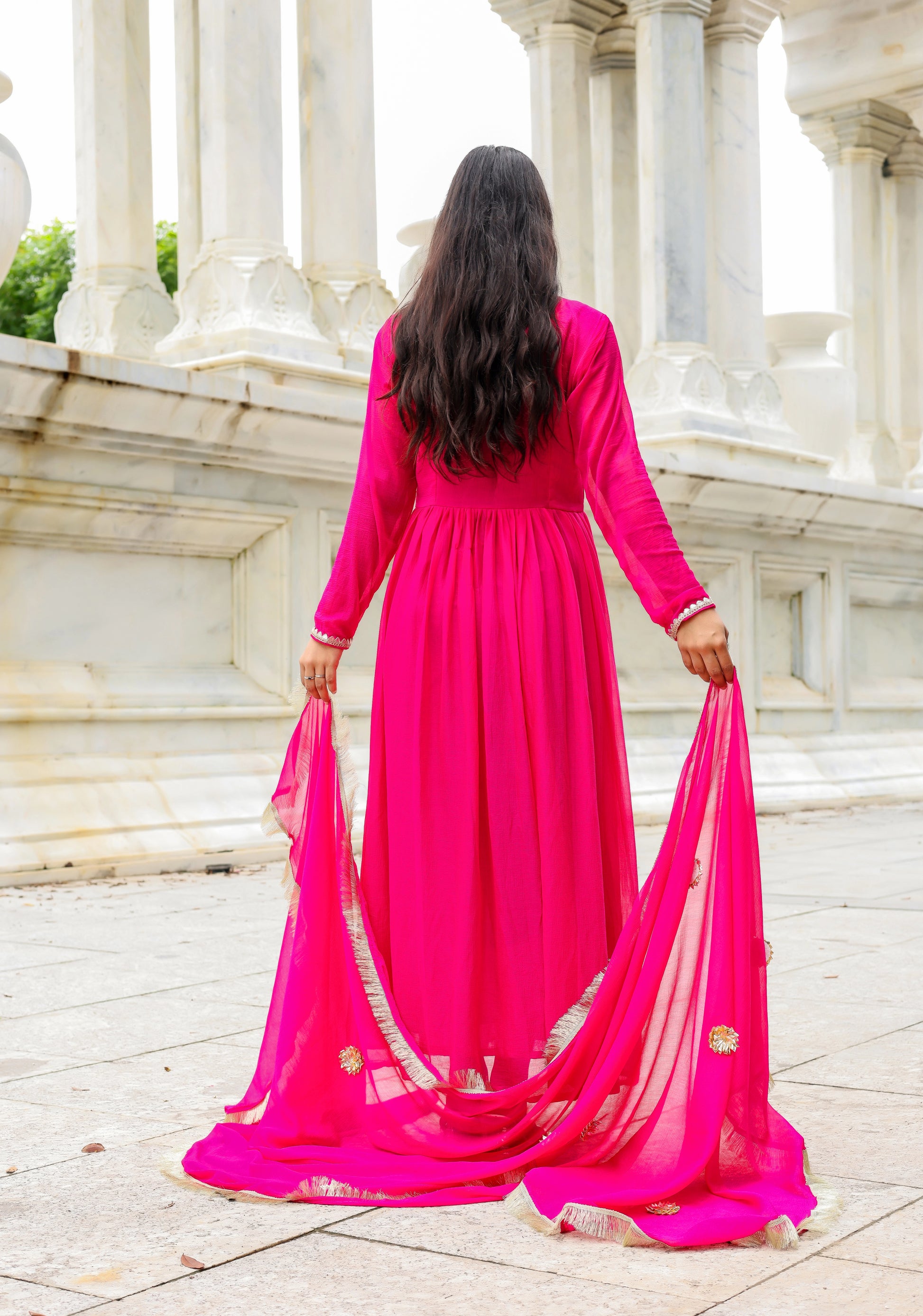 Grace meets festivity in our Gulabi Kiran, a vibrant pink chiffon Anarkali set designed to radiate charm. This two-piece ensemble pairs a flowing Anarkali with a delicately crafted dupatta, making it the perfect choice for festive gatherings and celebrations.