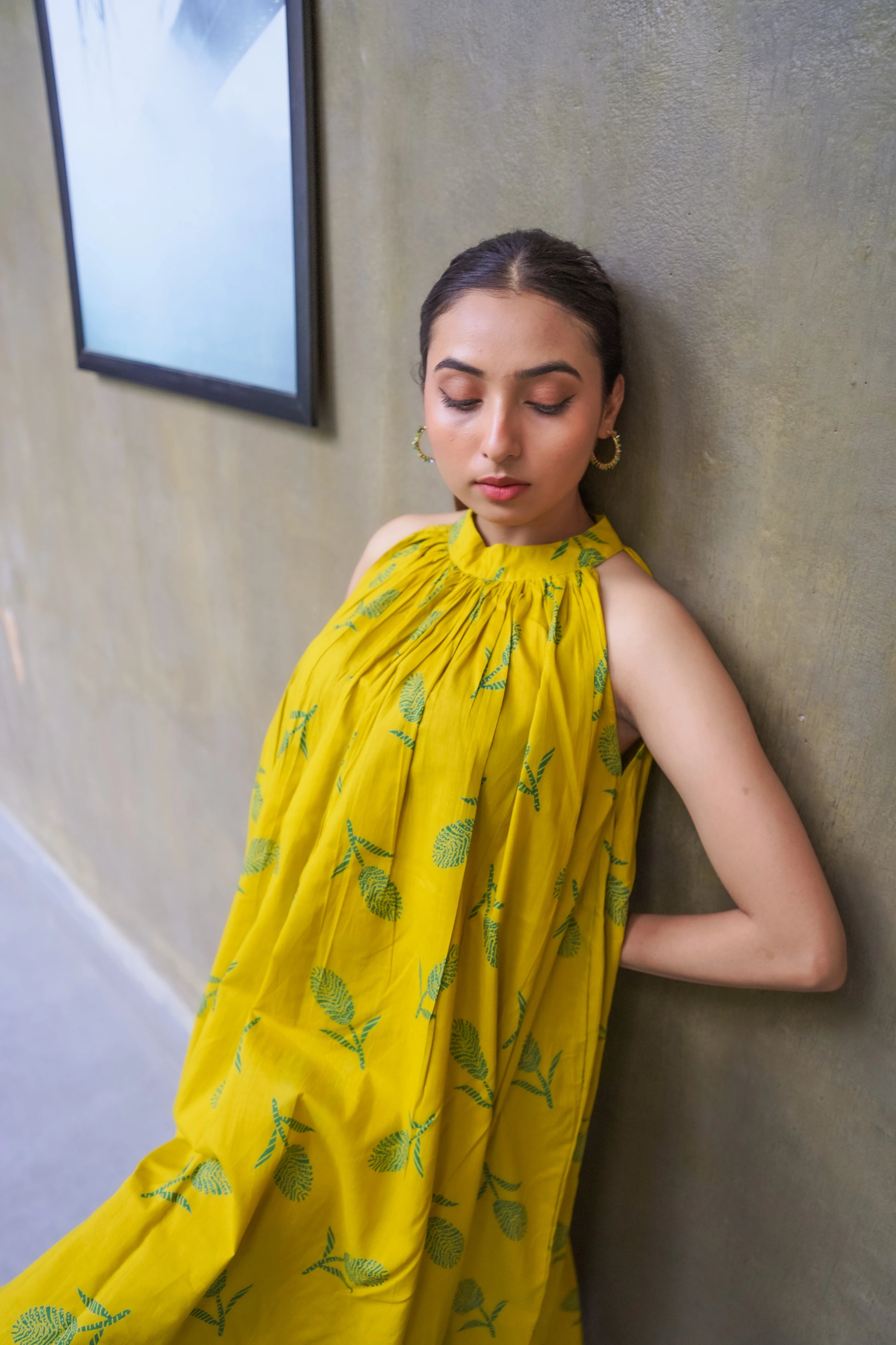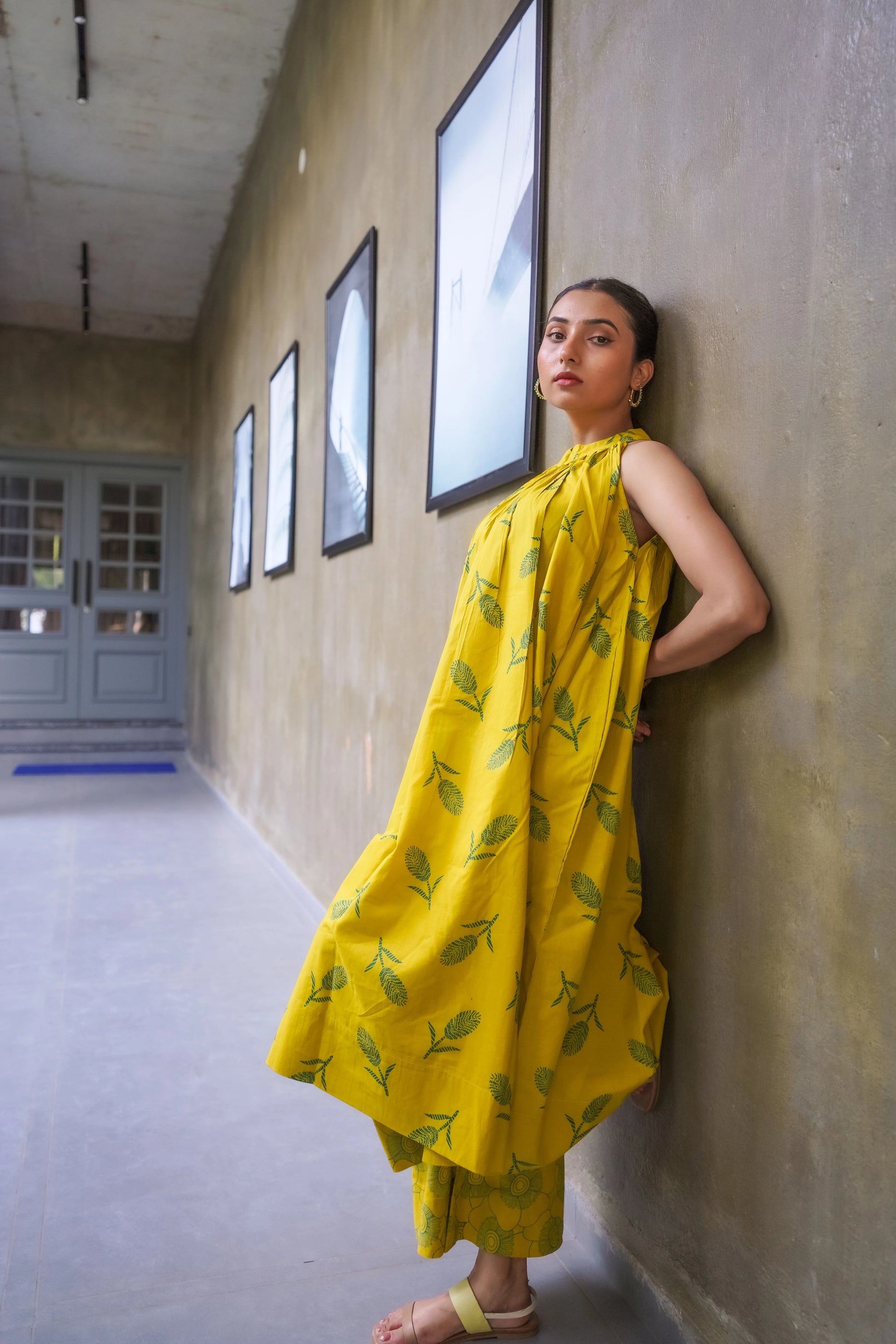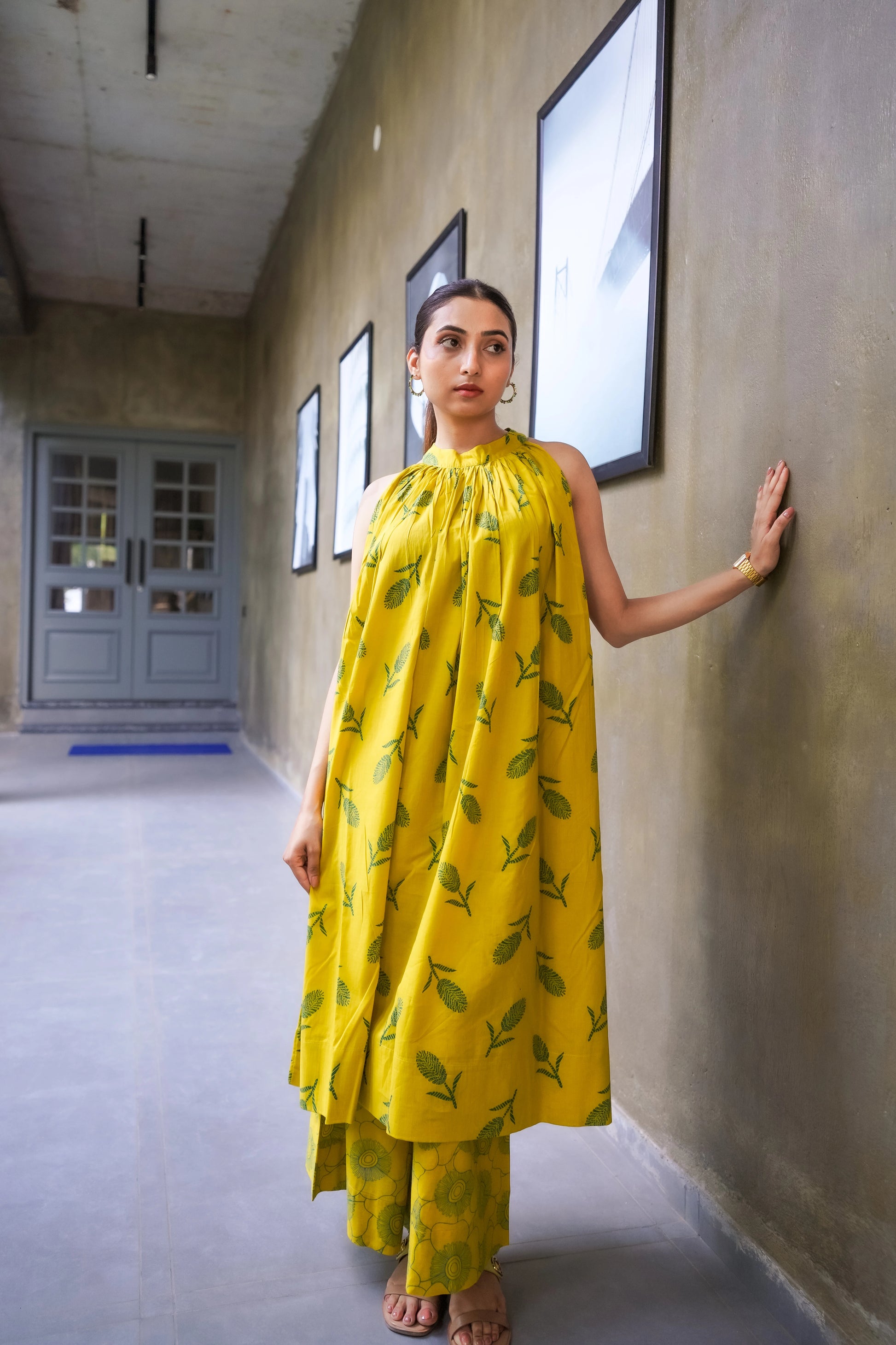 Crafted in soft, breathable cotton and drenched in a vibrant mustard yellow with green botanical motifs, this set brings together modern charm and traditional soul — ideal for brunches, casual gatherings, or a summer stroll through the city.