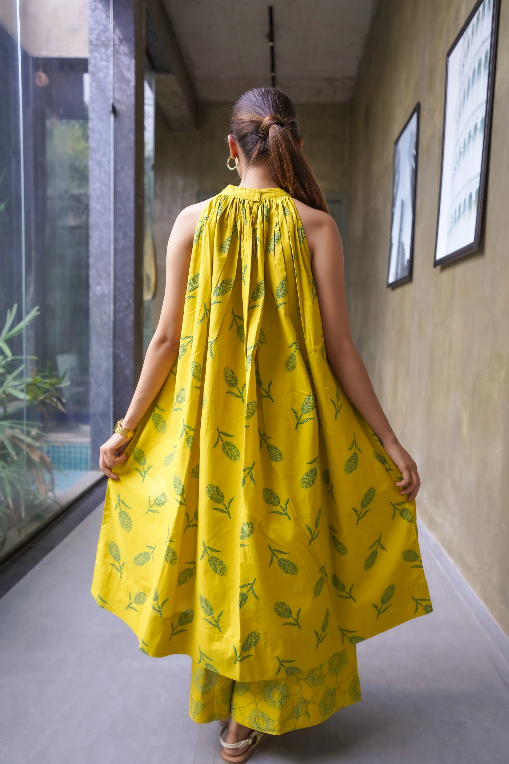 This two-piece co-ord set features a flowy halter neck kurta with delicate gathers that fall gracefully, paired with wide-legged printed plazo pants for a playful contrast.