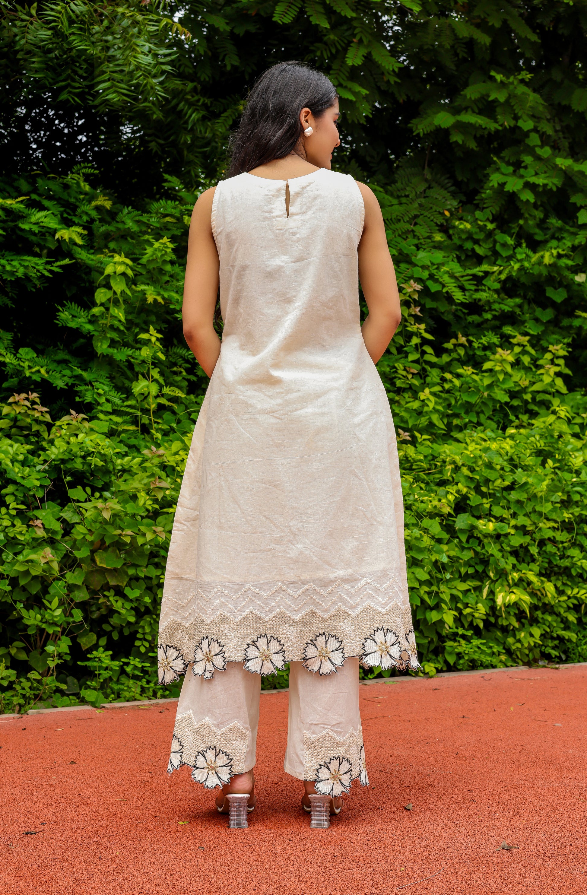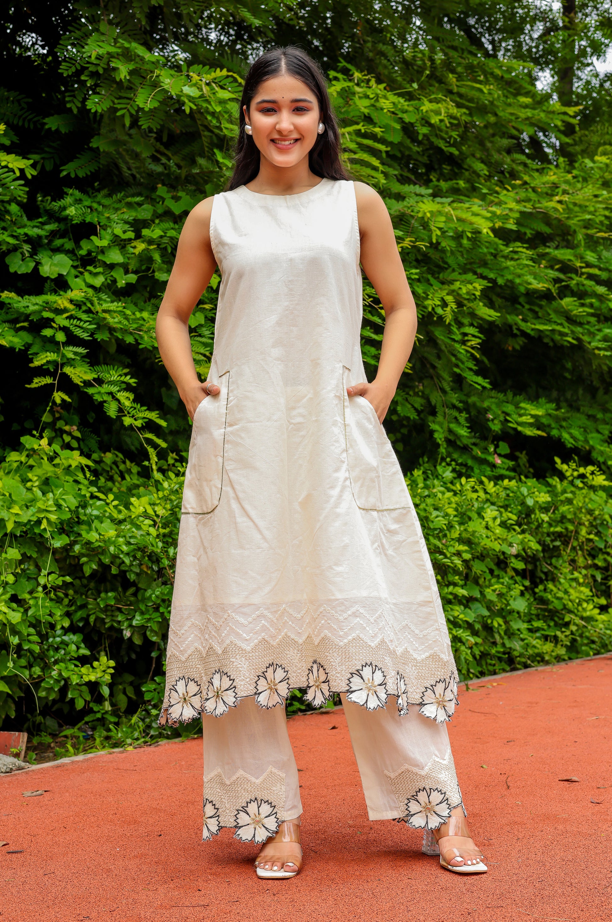 Crafted in breathable cotton slub fabric, this set is adorned with beautifully hand-implanted cutwork detailing along the hemline and pants, giving it a touch of festive elegance. The sleeveless straight kurta features a practical pocket for comfort, while the subtle ivory hue makes it versatile for both casual wear and office looks during festive times.