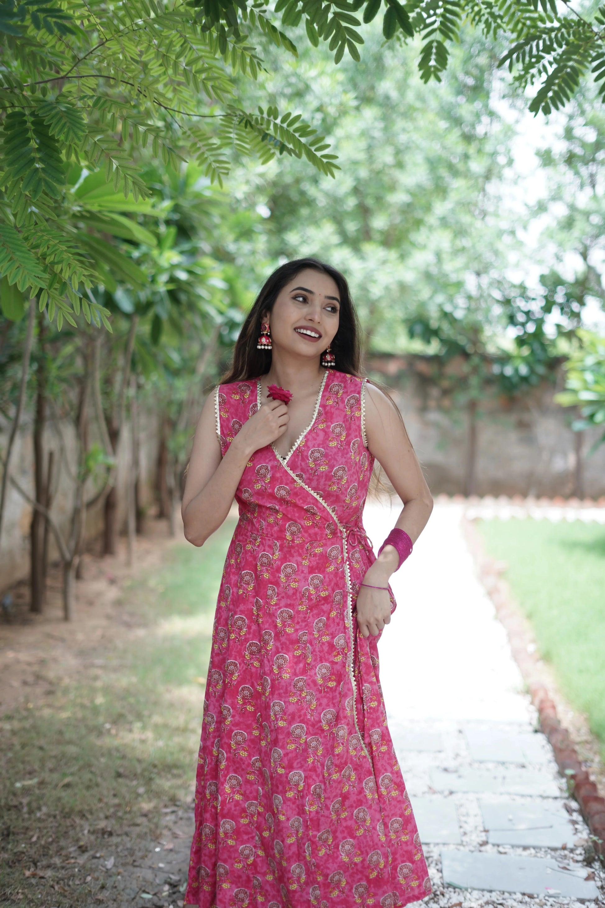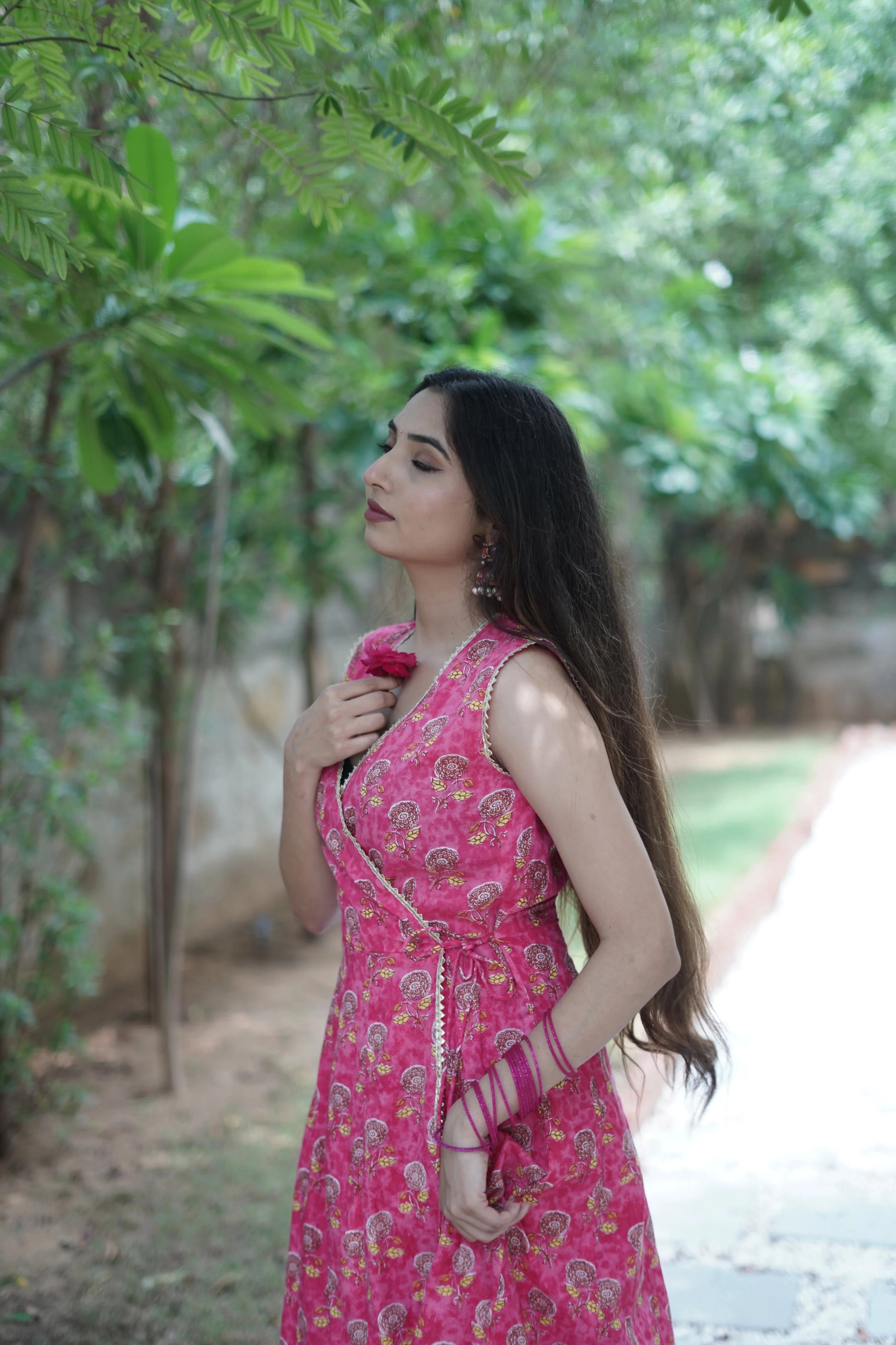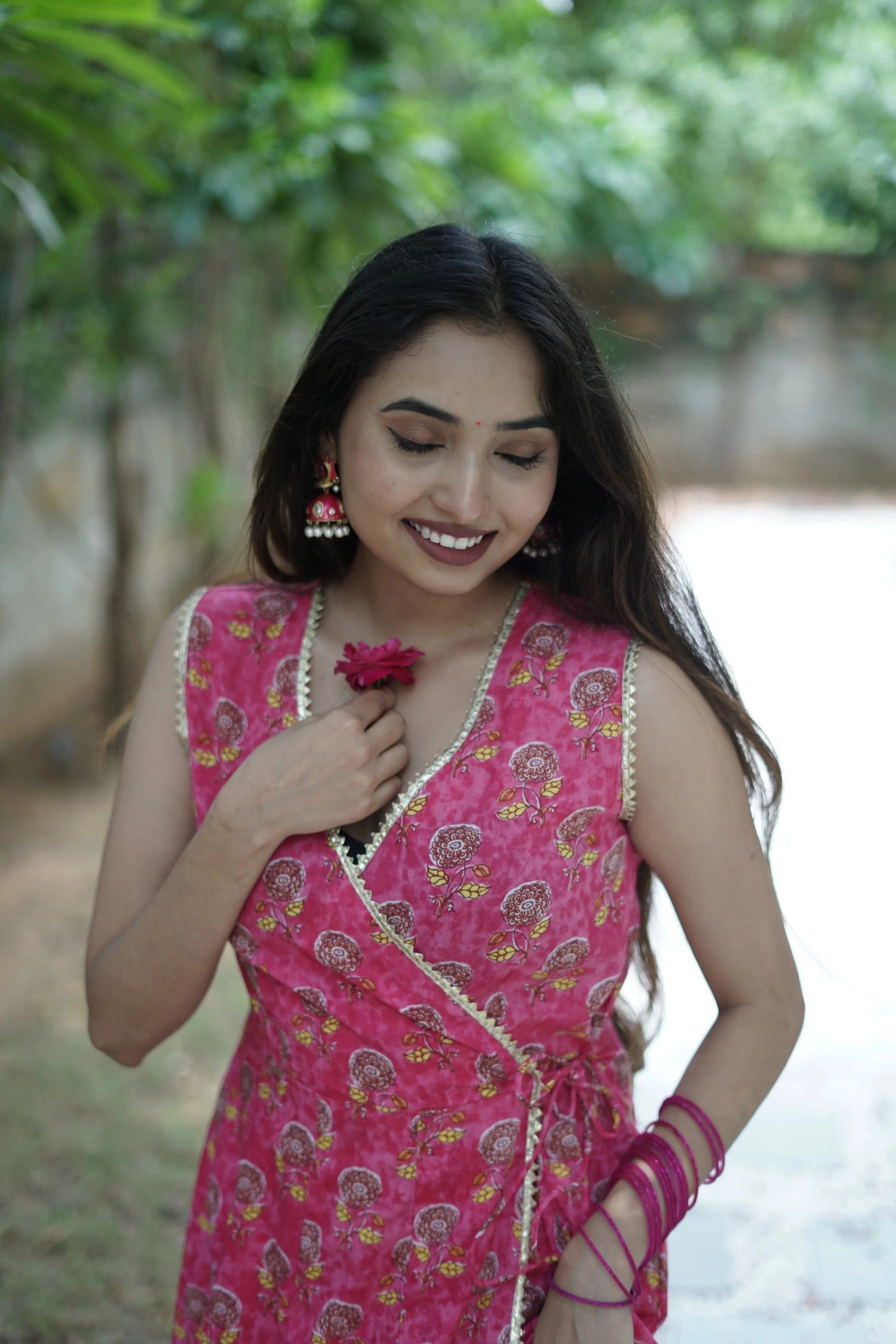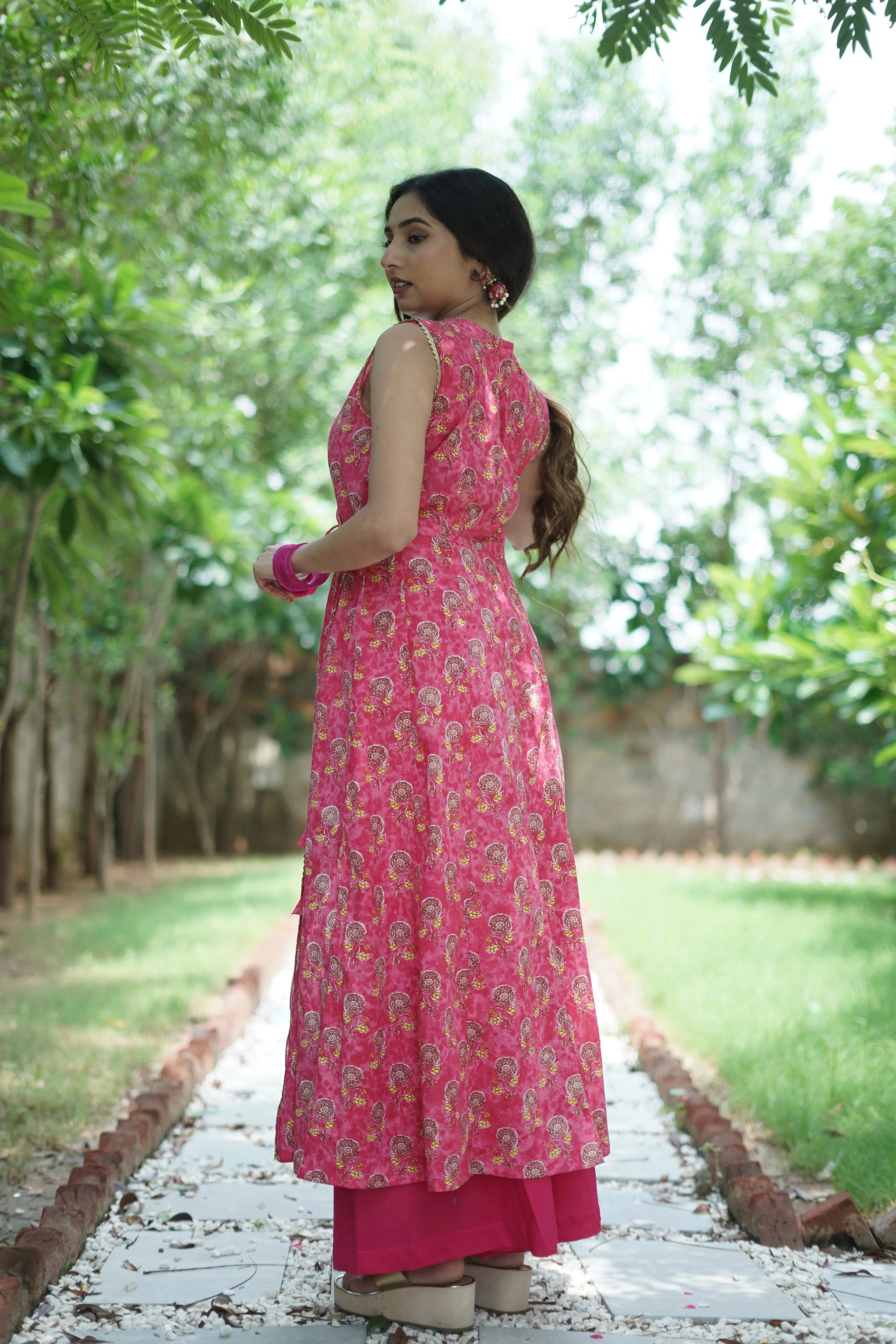 The sleeveless kurta, crafted in pure 60-60 cotton, is designed in a flattering Angarakha style, adorned with intricate lace detailing along the neckline and front. Its lightweight fabric ensures breathability and all-day comfort.