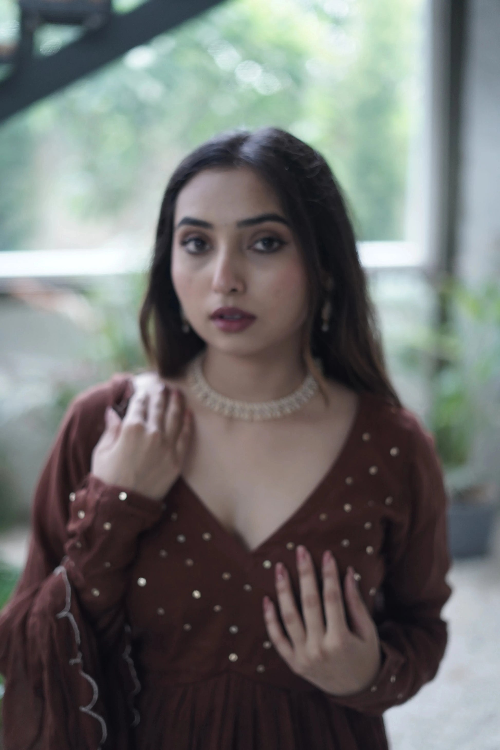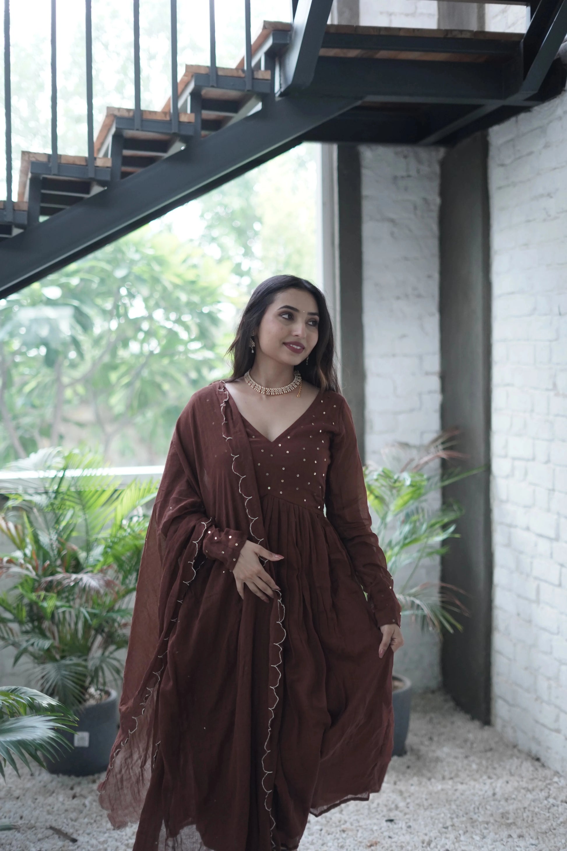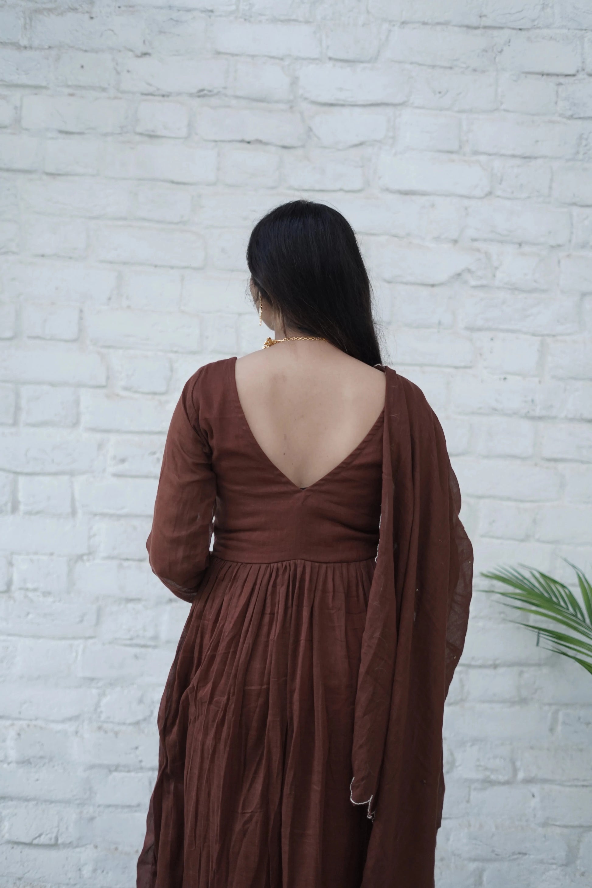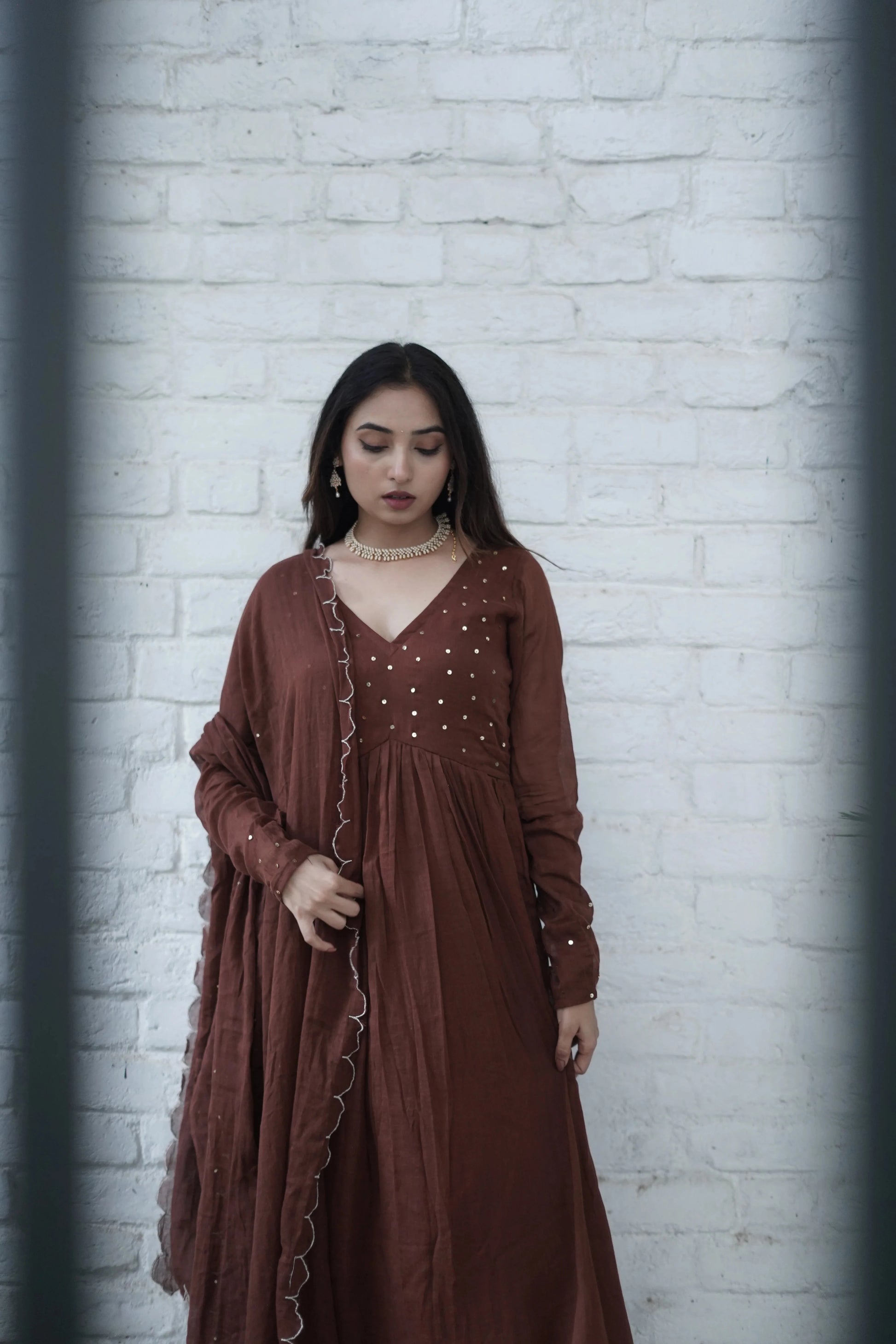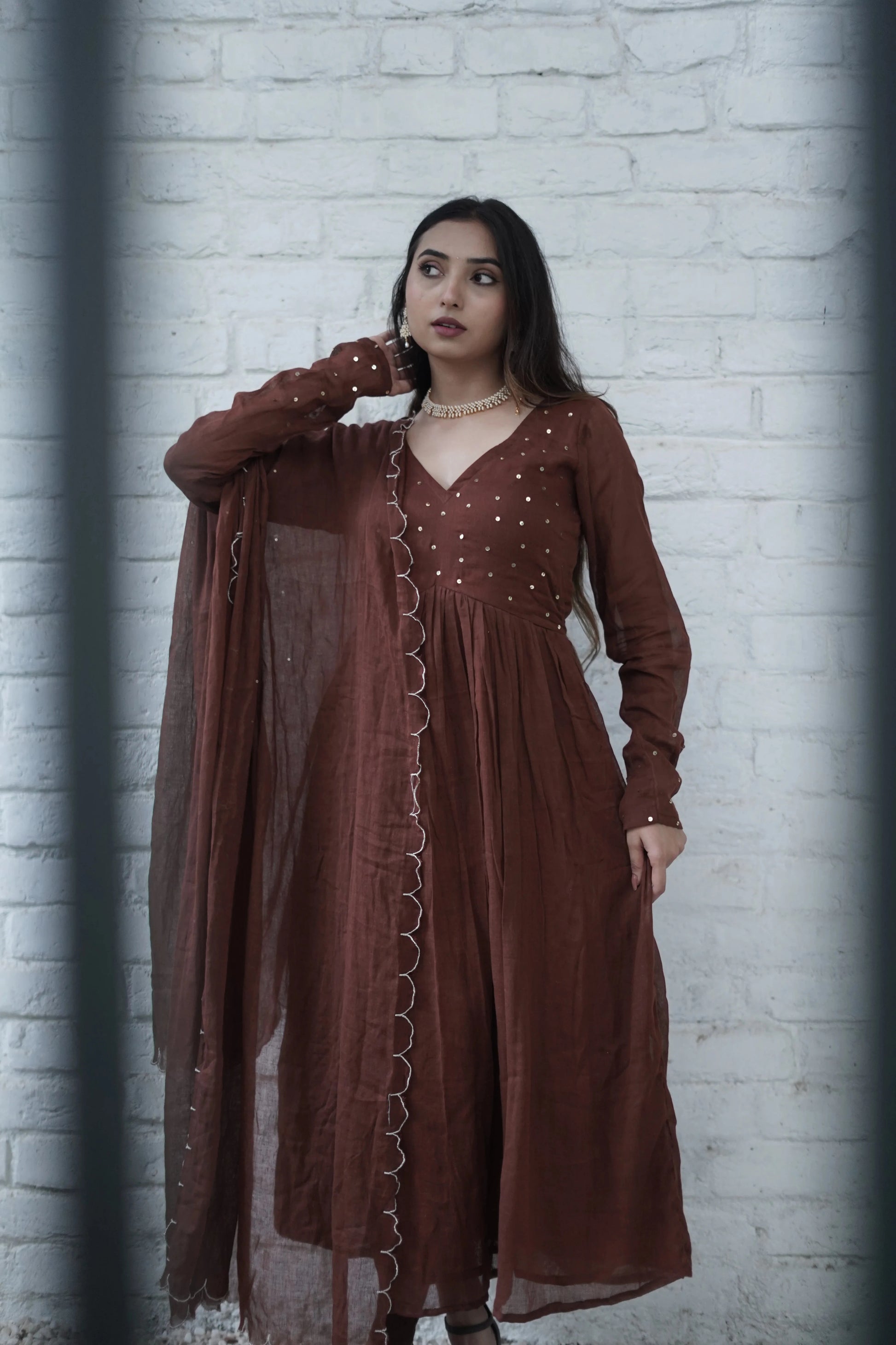 This two-piece set comes with a beautifully matching Mulmul dupatta, delicately edged with scalloped cut work and finished with subtle hand embroidery — a testament to fine craftsmanship. The deep brown hue adds richness and calm, making it perfect for intimate gatherings, poojas, or serene festive mornings.