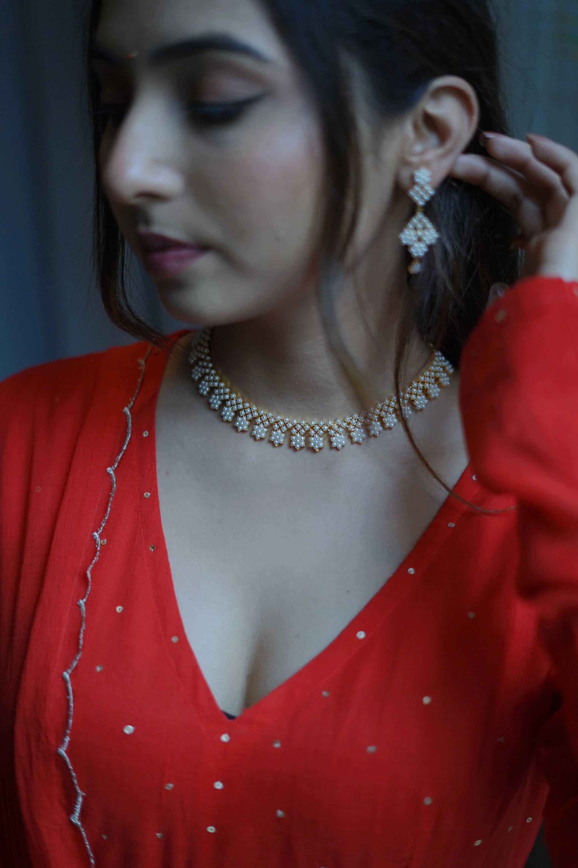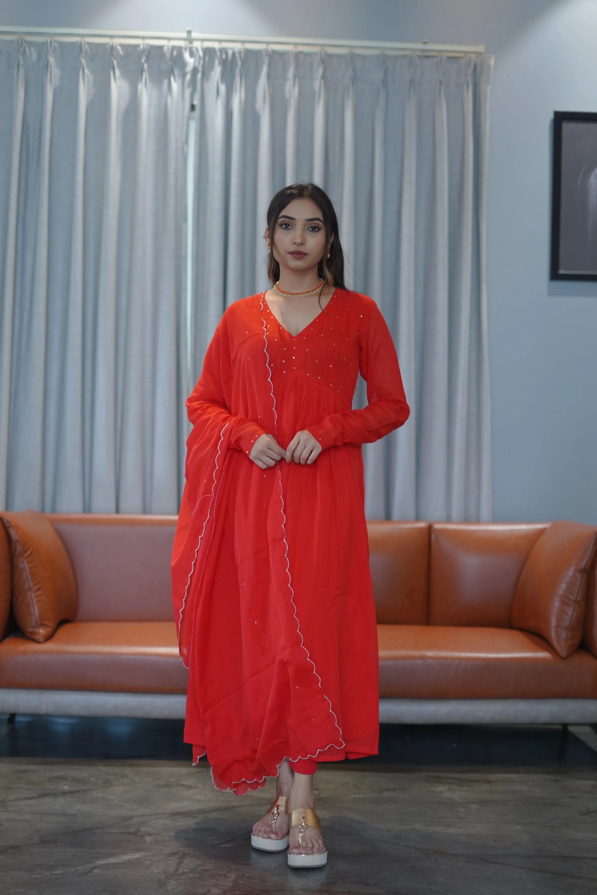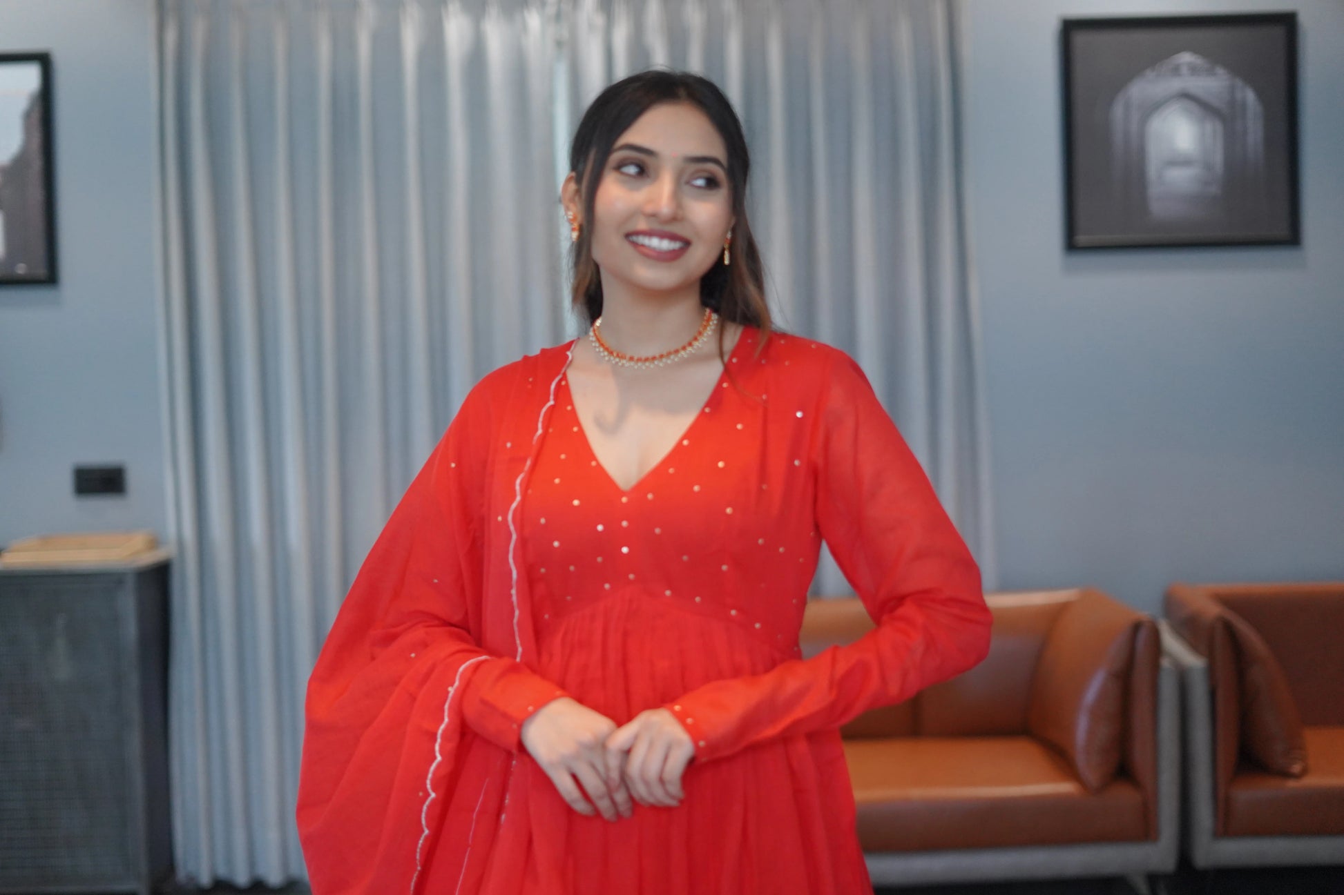 Introducing the Taashi Malmal Kurta Set — a celebration of minimalism and tradition in a striking vermilion red hue. Made from soft and breathable Malmal cotton, this kurta features a fully lined interior for comfortable wear, while delicate hand-done sequin work adds a graceful festive shimmer to the bodice.